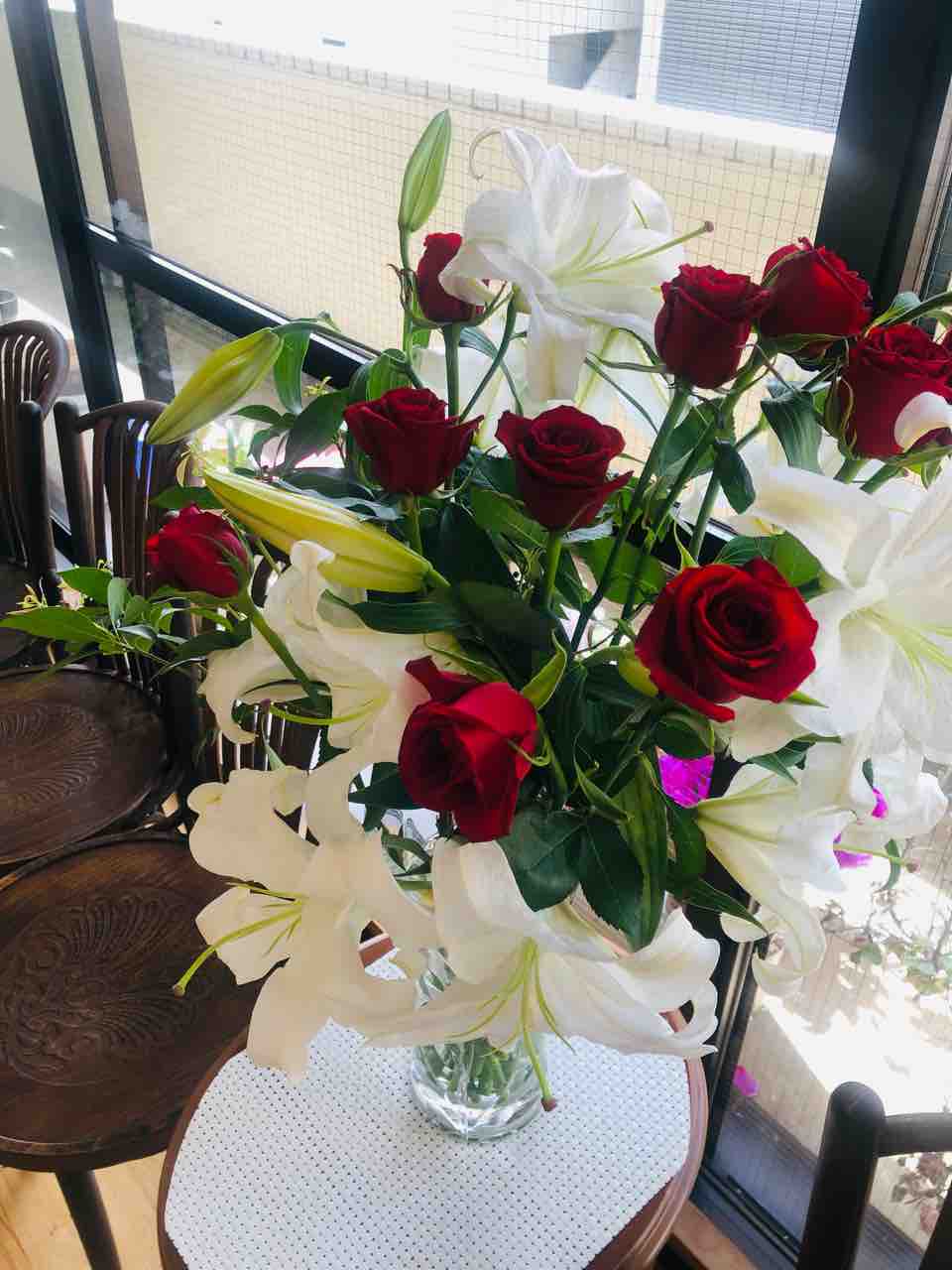 2022年04月25日 パーティーの花束 こんにちは海宝ダンススクールの美和子です😊先日友人の先生のパーティーがあり賛助出演させて頂きました。とても盛会で素敵なパーティーでした。パーティーの全体の写真をいつも撮り損なってしまいアップできません…😭生徒さんに頂いた素敵なお花をスタジオに飾ったので情熱の赤い薔薇と白いカサブランカ最強の組み合わせですね✨